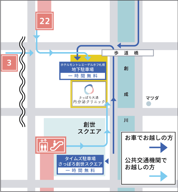 創世スクエアの中を抜けてお越しになると雨・雪の日もほとんど外を歩くことなく便利です。